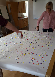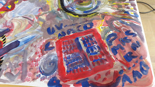 Vi fick måla tillsammans. Det blev en fantastisk färggrann målning. Ser du min fjäderpenna mitt i alla färger?