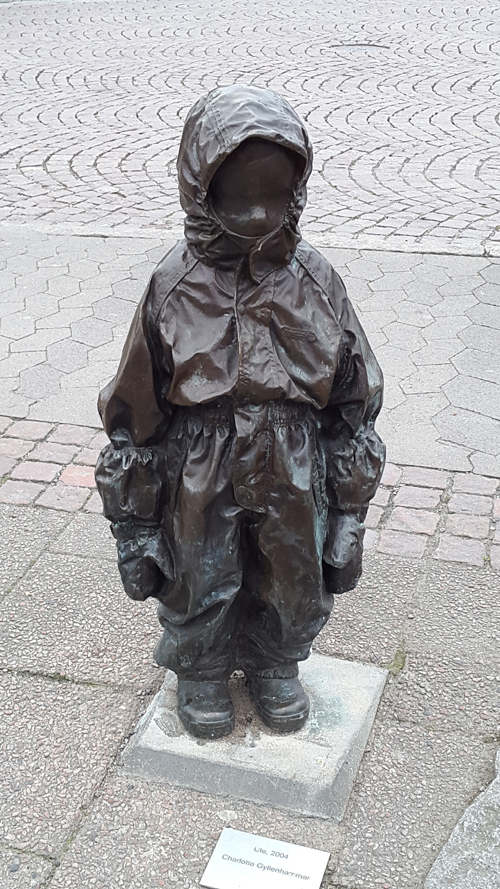 Den här lilla ledsna pojken i regnkläder är döpt till Ute. Alla som passerar honom klappar honom på huvudet. Det gjorde jag också, och smekte hans kind, för det var något alldeles extra med honom, något magiskt, som om en kraft bodde i den lille pojken. När jag berättade om honom för gymnastikläraren dagen efter, berättade han för mig hur han hade cyklat rakt på statyn en gång och fallit omkull. Nu minns jag den lille pojken av olika anledningar.