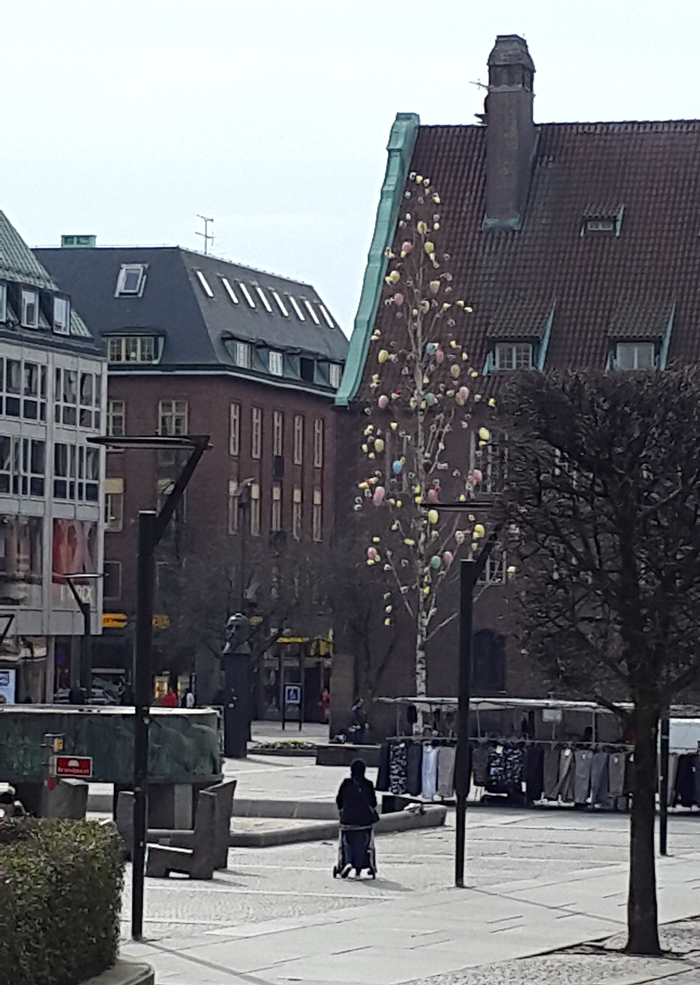 När jag anlände till Borås i måndags var det +18 grader och strålande sol. Jag var alldeles för varmt klädd, det insåg jag genast jag gav mig ut på promenad för att utforska staden. Mitt på stora torget stod påskpyntet fortfarande kvar.