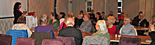 Kim M Kimselius föreläser för Skönlitterära Författarsällskapet Stockholm Nord.Jag fick en fin blomsterbukett och en halv resväska med böcker med mig hem, så det blev tungt bagage på hemvägen.