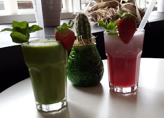 Vi gick på RAW-kafé och drack Smoothies. Jag valde brännässlesmoothies. Har plockat och torkat brännässlor som jag ska ha i mina smoothies här hemma. Supergott!
