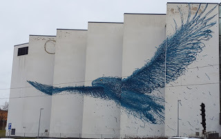 Det här var en mäktig fågel som sträckte sig utefter en hel byggnad. Tänkte på min bok