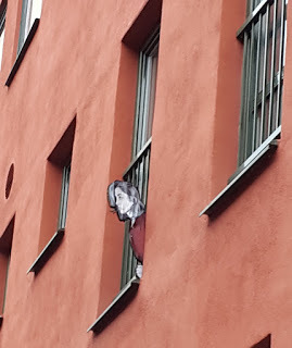 "Ser du kvinnan i fönstret?" frågade Linda och jag tittade, utan att hitta henne. Linda pekade ut kvinnan, som även hon var ett konstverk.