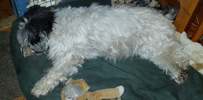 I helgen har Tickie varit trött och sovit mycket. Hon har tumörer och har svårt att uträtta sina behov. Det kändes tufft att ta bort henne, men jag vill inte att mina hundar ska lida. Så trots att jag sitter här och gråter floder vet jag att hon nu inte behöver kämpa mer.