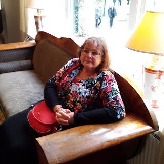 Kortet togs på mig när jag satt i Fritiof Nilsson Piratens rum på Grand hotell i Lund. Det var min mans bror som begravdes. Sorgligt nog, men för min del återupplevde jag pappas begravning som jag nyligen gick igenom. På pappas begravning hade jag just de här kläderna, för han ville ha en "glad" begravning. Därför tog jag på dem även till min svågers begravning. Jag var den enda med färgklickar på kläderna, alla andra bar helsvart. Men det är okej, det här är jag.