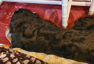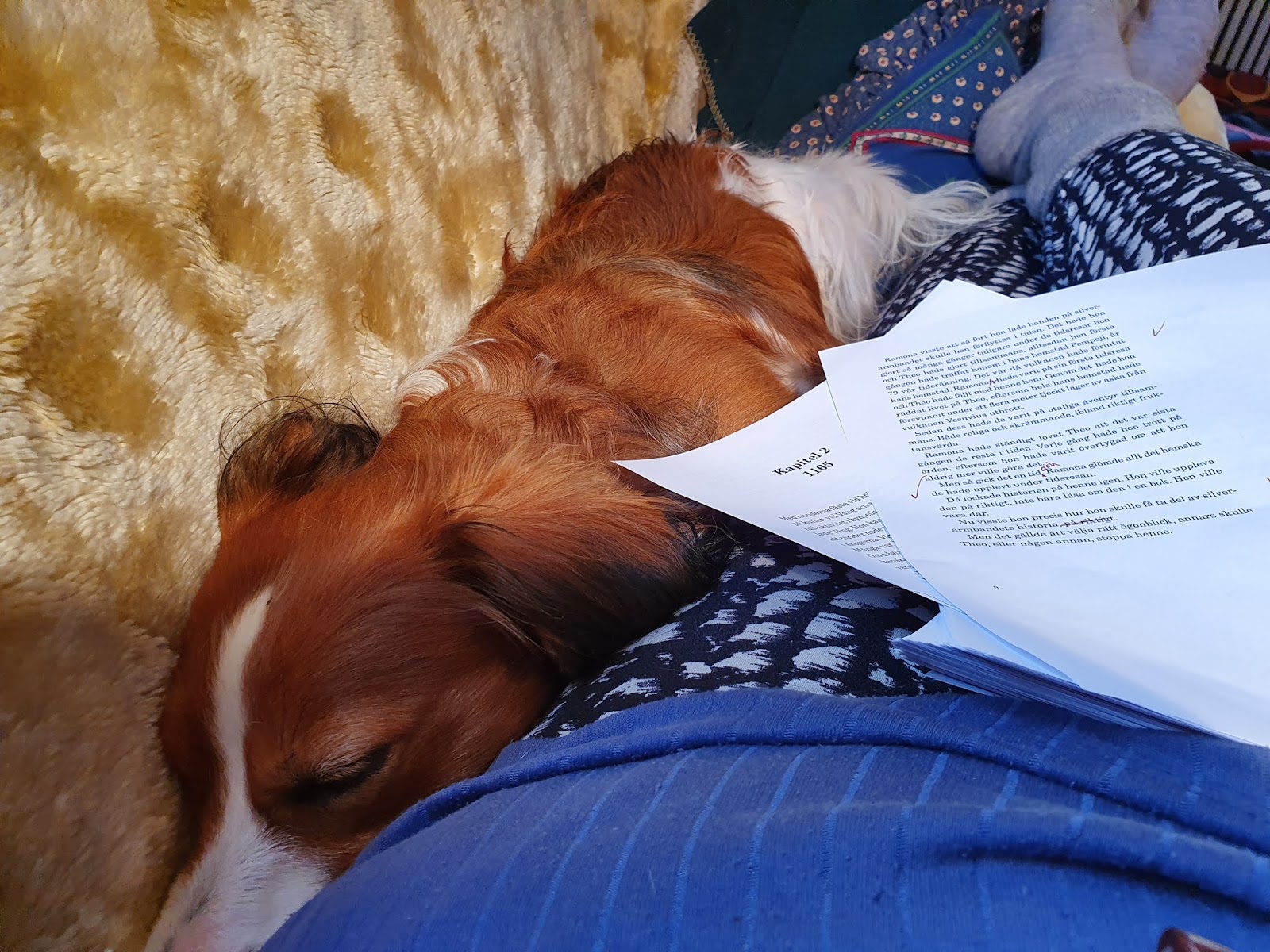 Nu ligger hon och surar efter att jag har skällt på henne för att få bort henne från mig. Jag har bytt byxor för de blev alldeles blöta. Allt för ett litet fotografi på den nyutkomna boken Svarta Döden.