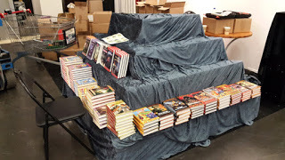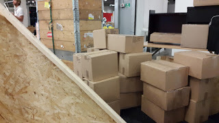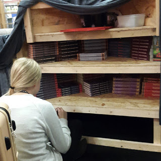 Så här ser baksidan av pyramiden ut, där har vi ett lager av böcker, Fanny håller på att packa in dem.