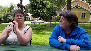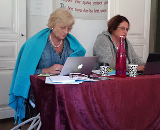 Grannen, Anna-Karin, tvärs över sjön, hade varit vänlig nog att ro över sin båt för att kursdeltagarna skulle kunna koppla av med en roddtur på sjön. (Tack så mycket Anna-Karin!) Här är det Beatrice som sliter vid årorna medan Titti leker drottning. Beatrice sa att om hon ramlade i, skulle hon bli en livserfarenhet rikare och kunna skriva om det. Åh, vad roligt vi hade!