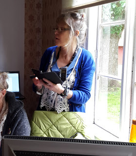 Några hade tagit med sig husvagn och bodde ute på gården under en vacker lind. På lördagskvällen gick de med konstnären Raisa Uotila hem, som även hon gick skrivarkurs för mig. När vi sedan pratade om att ge ut en antologi till nästa höst, föreslog alla att Raisa skulle illustrera boken och göra bokomslaget. Spännande!