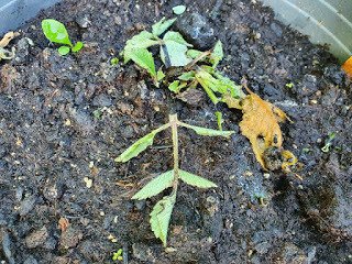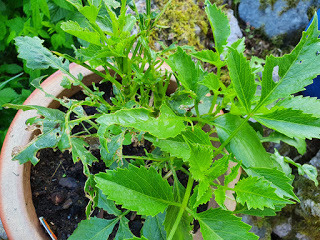 Det här var tidigare en fin dahliaplanta. I natt har ett gäng Mördarsniglar haft party i krukan och ätit upp alltihop.