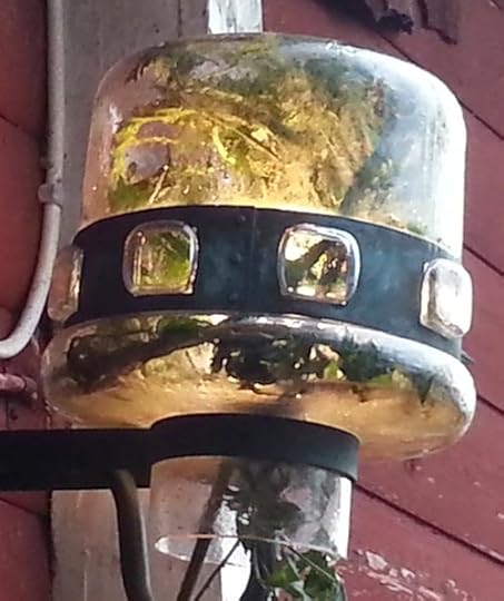 På kvällarna har jag undrat varför ytterlampans sken har varit så svagt. Jag blev mycket förvånad när jag såg att det berodde på att Björnbärsbusken har krupit in i lampan och mår gott i värmen.
