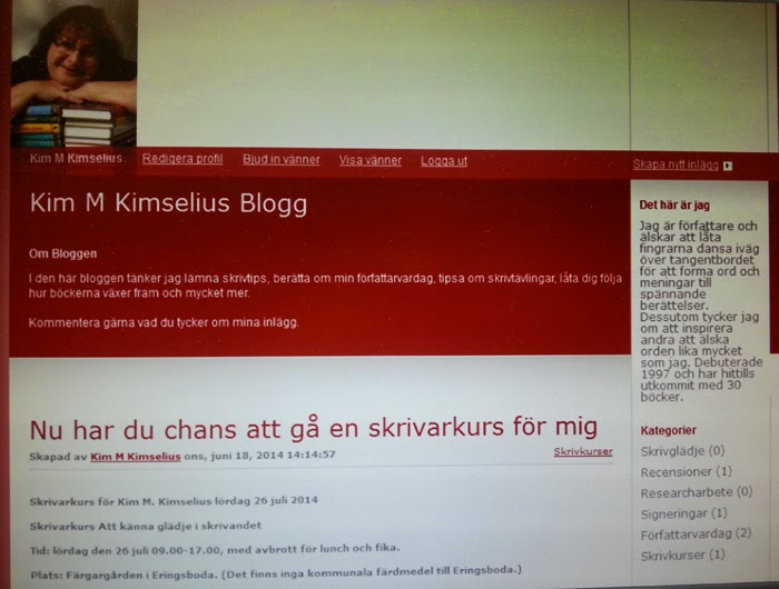 Tanken är nämligen att den nya bloggen ska bli lite mer av en vardagsblogg. Här kan du följa min författarvardag, jag är mer personlig på Kim M Kimselius Blogg . Även i den nya bloggen kommer jag att lämna skrivtips, för det är liksom den jag är :-) Jag brinner för att dela med mig till andra av min skrivglädje. ( Du har väl inte missat att anmäla dig till min skrivarkurs 26 juli? )