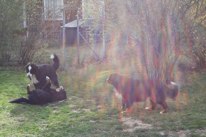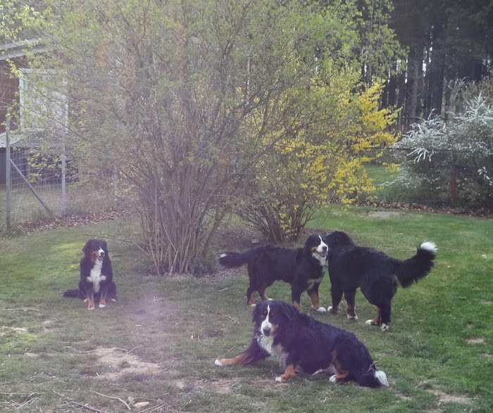 Hundarna stängs ut i den stora hundgården på 200 kvm. Normalt får hundarna gå ut och in som de själva vill, men det blir trångt i huset med många gäster och hundarna får finna sig i att bara stå och kika på oss.