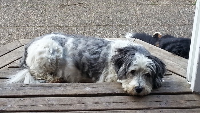 Pluto tycker det är perfekt att ligga i gången, trots att solen gör det stekande hett. Här är han ensam och kan sova i lugn och ro.
