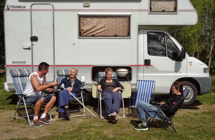 Perfekt med gäster som har det egna boendet med sig, till och med stolar. Jag kallade dem för "ledighetskommittén" för de såg så härligt avslappnade ut i solen. Här är det från vänster, Patrik, min käre far Harry, Madeleine och Linda.