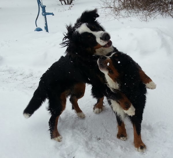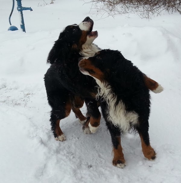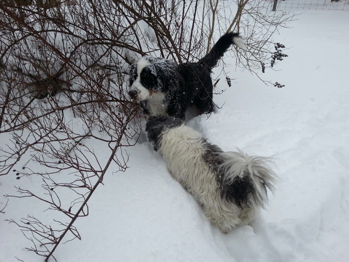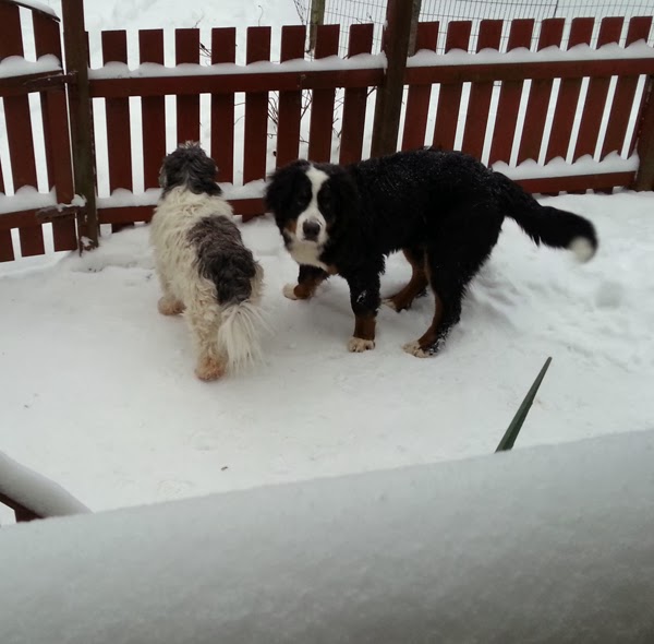 Här ser du tydligt hur mycket snö det är. Tickies ben försvinner helt och halva Tudors ben också.