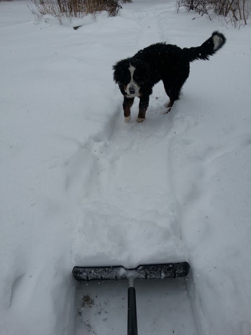 Om du tror att jag ser så här glad ut för att jag tycker om att skotta snö, då har du fel, jag ler glatt för att jag ser hundarna leka med varandra i snön.