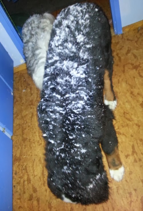 Inne efter en timma ute i snön och yrvädret, då ser hundarna ut så här när de kommer in. Tickie och Tudor letar fågelfrön som jag har spillt ut på golvet.