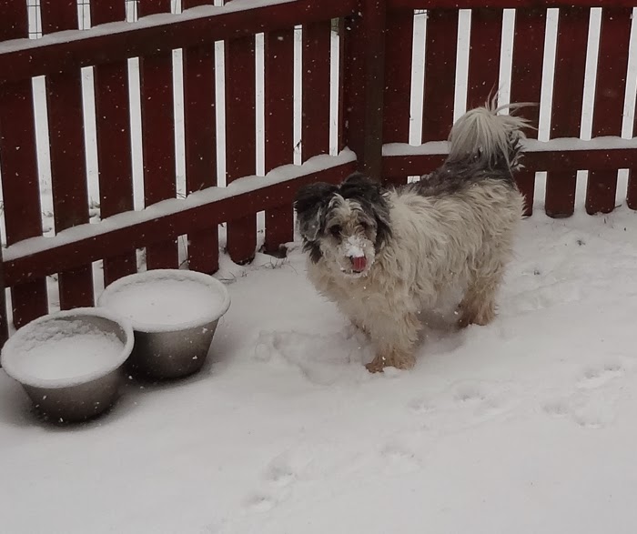 Till slut är det dags att gå in, och Tudor kommer i full fart när matte kallar, trots att han älskar snön. Jag som trodde jag skulle vara tvungen att muta honom med köttbullar.