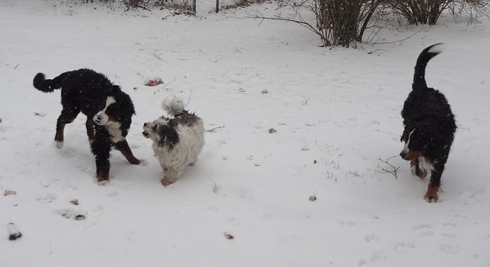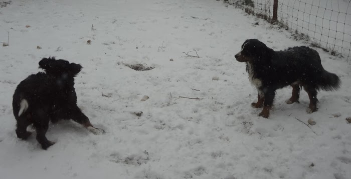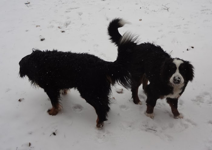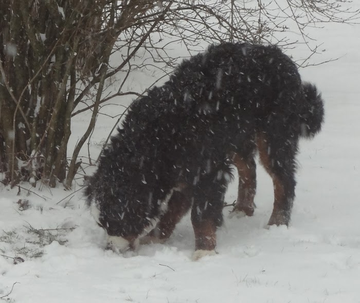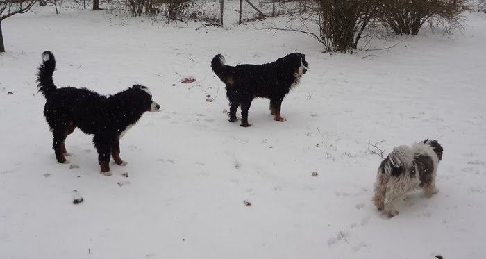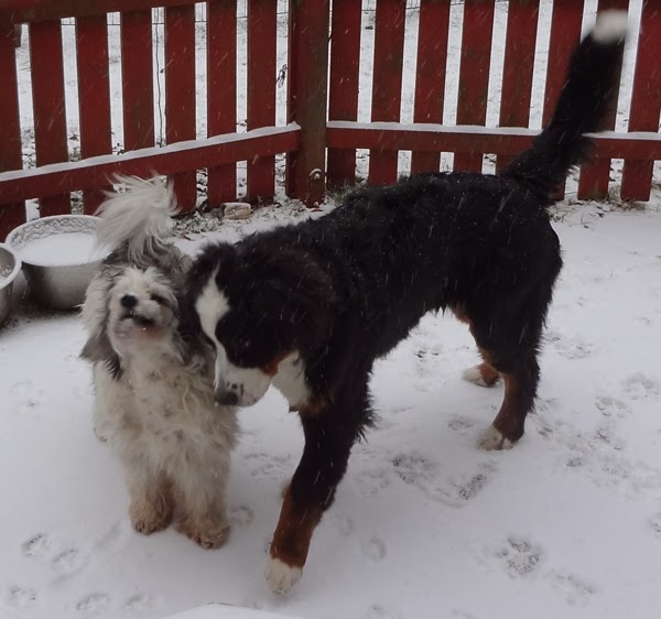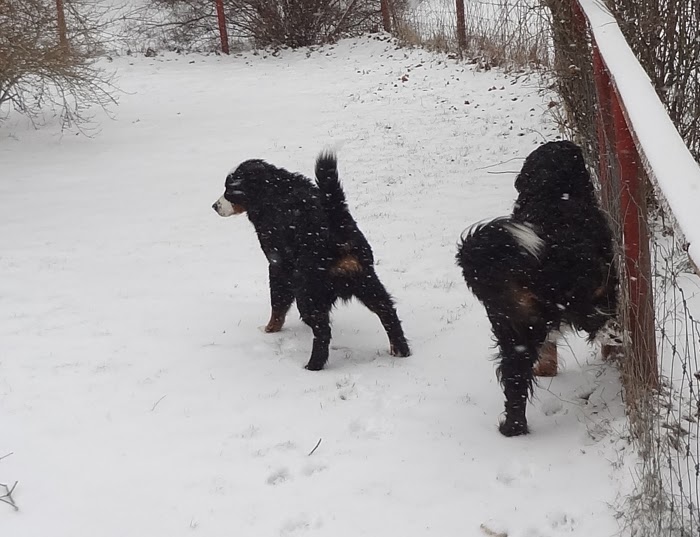 Lunchdags och kisspaus. Nu har det kommit mer snö och snöar också mera. Här är det Tudor och Pluto som går på toaletten samtidigt.