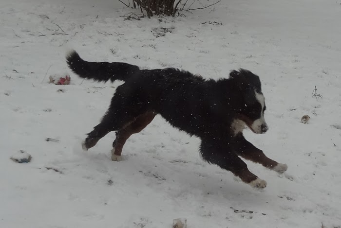 Äntligen fick jag uppleva Tudors glädje över snön. Du kan inte ana så många foton jag tog för att få de här bilderna. Det är inte lätt att fånga en livfull, liten sjumånaders Berner Sennenvalp .