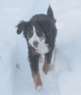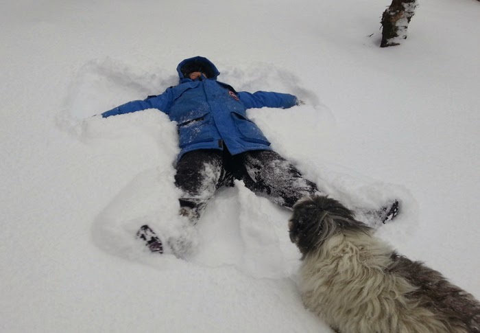 , försökte jag roa mig så gott det gick. Här gör jag snöänglar, med hjälp av Tickie. Januari-februari är de månader jag stänger in mig och skriver och skriver och skriver och skriver, för att endast pausa med hundpromenader.