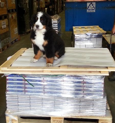 Tudor fick följa med oss överallt, social träning, men också för att vi inte ville lämna honom ensam så många timmar. Här är vi och hämtar böcker på lagerhotellet. Tudor vaktar dem åt oss.