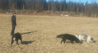 Tickie var med mig i stugan och tog det hela med ro. Tack och lov att det var hon, som var med, för hon kan hålla sig många timmar. Tänk om det hade varit valpen, han skulle ha varit tvungen att gå ut titt som tätt. Nu behövde vi inte gå ut under värsta stormen.Hela december var jag i stugan och signerade och när jag kom hem till Jan, Tudor och Pluto blev jag nästan chockad över att se hur mycket Tudor hade vuxit. Nu finns det inte en chans att de kan dela på en biabädd längre. Ändå ligger de nära varandra. Pluto har piggnat till och Tudor har fått en lugn och trygg lekkamrat.