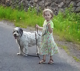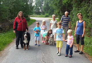 Det har blivit lite av en tradition att jag tar promenad på midsommardagen med grannen och deras gäster. Här ser du de som följde med i år. Det blev lite gruffande om hundarna i år, eftersom jag bara hade två, mot de vanliga fyra-fem.