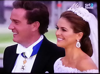 2013 var det dags för prinsessan Madeleine att gifta sig med sin Chris. Jag hade inte haft en tanke på att se bröllopet, men Jan retade mig hela dagen och sa "Du vill allt gärna se det, erkänn!" Till slut tänkte jag "Äsch, jag ser väl en liten bit då", sedan var jag fast och såg hela bröllopet. Bilden är fotograferad på min tv.