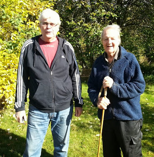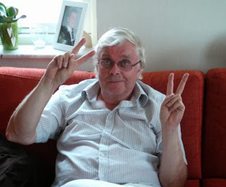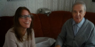 fick Tudor vara hos uppfödaren, medan de andra hundarna var hemma med hundvakter. På väg till bokmässan stannade vi till hos käre far. På bilden ser du Jan och pappa Harry.