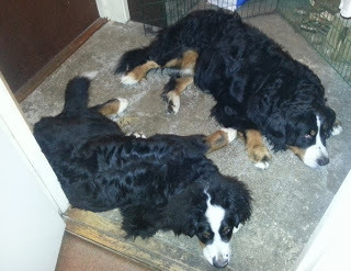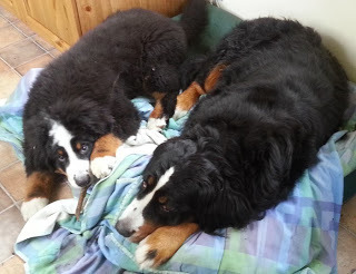 Det var lite tomt med bara två hundar och Pluto är gammal, så jag tyckte det var dags att börja leta efter en Berner Sennenvalp. Ibland kan det ta flera år innan man kan få tag på en. Här ser du Tickie och Pluto.