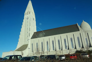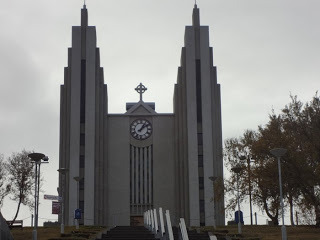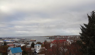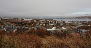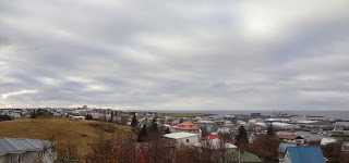 Efter avslutade föreläsningsdag var det dags för lite mat innan jag åkte till flygplatsen för vidare färd till Akureyri . Här utsikt över Reykjavik med kyrkan som reser sig mäktig över staden.