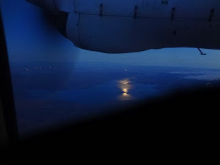 Vi flög över vulkaner och glaciärer och jag förundrades över de ormar av ljus som dök upp och plötsligt släcktes ned. Tills jag insåg att det var månen som lyste upp vattendrag och sjöar och höll oss sällskap hela vägen till Akureyri. Där fick jag uppleva ett hissnande ögonblick när planet gick ned i mörkret och jag insåg att det där stora svarta, med vitt på toppen var en stor bergvägg alldeles utanför flygplansfönstret.