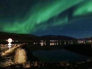 Så här vackert var det i Akyreyri på kvällen, med himlen flammande av norrsken, tänkte på de japanska turisterna som var med på planet, de blev säkert nöjda när de såg det, eftersom det är därför de reser till Island.