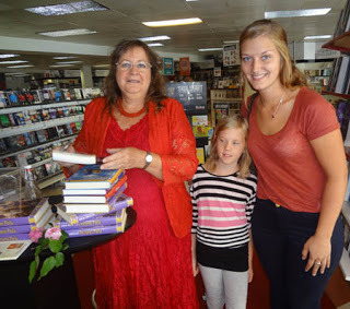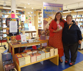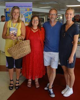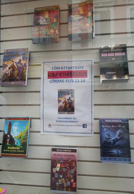 Som ni ser på allas kläder var det sommartemperatur ute, ljuvligt väder. Det hindrade inte läsarna att slinka in i butiken för att köpa en ny laddning av mina böcker. :-)