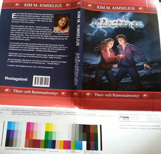 Nu har alltså ett korrektur på omslaget kommit. Nu har jag en sista chans att se om jag har missat något fel i texten, men jag ska även kontrollera att omslagets färger blir bra. Det är därför det ligger en färgskala längst ned på provtrycket.