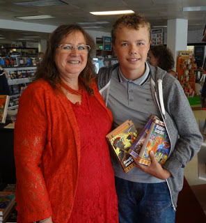 Här är en trevlig ung man som hade kunnat nöja sig med en bok, eftersom jag ändå kom tillbaka snart för att signera... Pappan var ihärdig och det blev tre böcker till slut ändå. Båda två såg rätt nöjda ut när de gick.