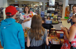 Det är fart och fläkt vid signeringarna. Några köpte sex böcker, som vid det här tillfället. En del köpte en bok, men de allra flesta köpte tre stycken. Mycket beroende på det fantastiska priset, tag tre böcker betala för två. Jag brukar alltid säga "Köp två böcker och få en extra bok gratis!". Om jag säger som det står på skylten brukar det alltid bli så här: "Tag två böcker, betala för tre!" DET tycker inte kunderna är något bra pris...