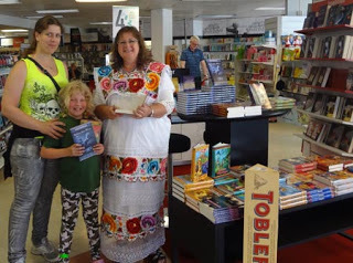 Det är inte min Toblerone. De lyckliga vinnarna är de som just har köpt några av mina böcker, också trogna fans och läsare. Som du ser har jag min fina klänning ifrån Mexiko på mig. Jag tycker den är otroligt vacker och är glad att jag lyckades hitta den när jag var på