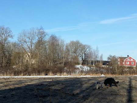När solen vaknat är det dags att lämna datorn för en stund och ta en längre morgonrunda med hundarna. Under en veckas tid har ängarna varit nästan snöfria och frusna, därför har vi flanerat över de stora öppna vidderna, hundarna och jag, medan solens strålar värmt min kropp och själ.