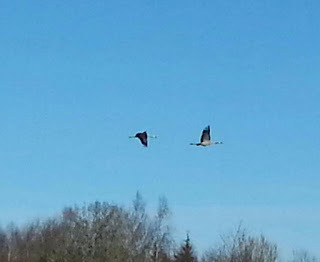 Tranorna har kommit för att stanna och jag hör deras skri varje dag och det fyller mitt hjärta med sång och vårkänslor. Just det här tranparet på bilden ovan, stod på ängen vi spatserade över. De blev lite förnärmade över vår ankomst, lyfte och flög lågt över mitt huvud, kretsade runt ett varv, innan de slog sig ned en liten bit längre bort.