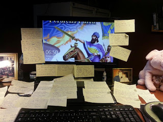 I det här läget har jag redan betat av en hel del lappar och det här är de som återstår. Allteftersom jag skriver tar jag bort lapparna, en efter en och det blir allt renare på arbetsytan runt datorn. Idag tog jag alltså bort den sista lappen och skrev det sista ordet i "benet".