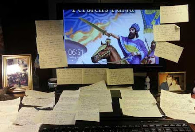 Under alla lapparna ligger min dator gömd och jag är glad för den stor skärmen som rymmer en hel del lappar! Vad du inte ser på bilden är att det utifrån den här platsen löper ett skrivbord på vardera sida och de är belamrade med lappar och faktaböcker.