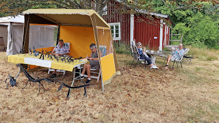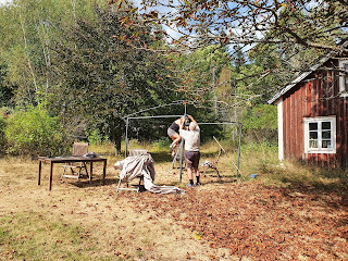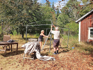 Både när vi satte upp tälten och tog ner de var det 30 grader varmt och svetten flödade. Jag gick 16.000 steg i söndags när jag bar in allt i uthusen.