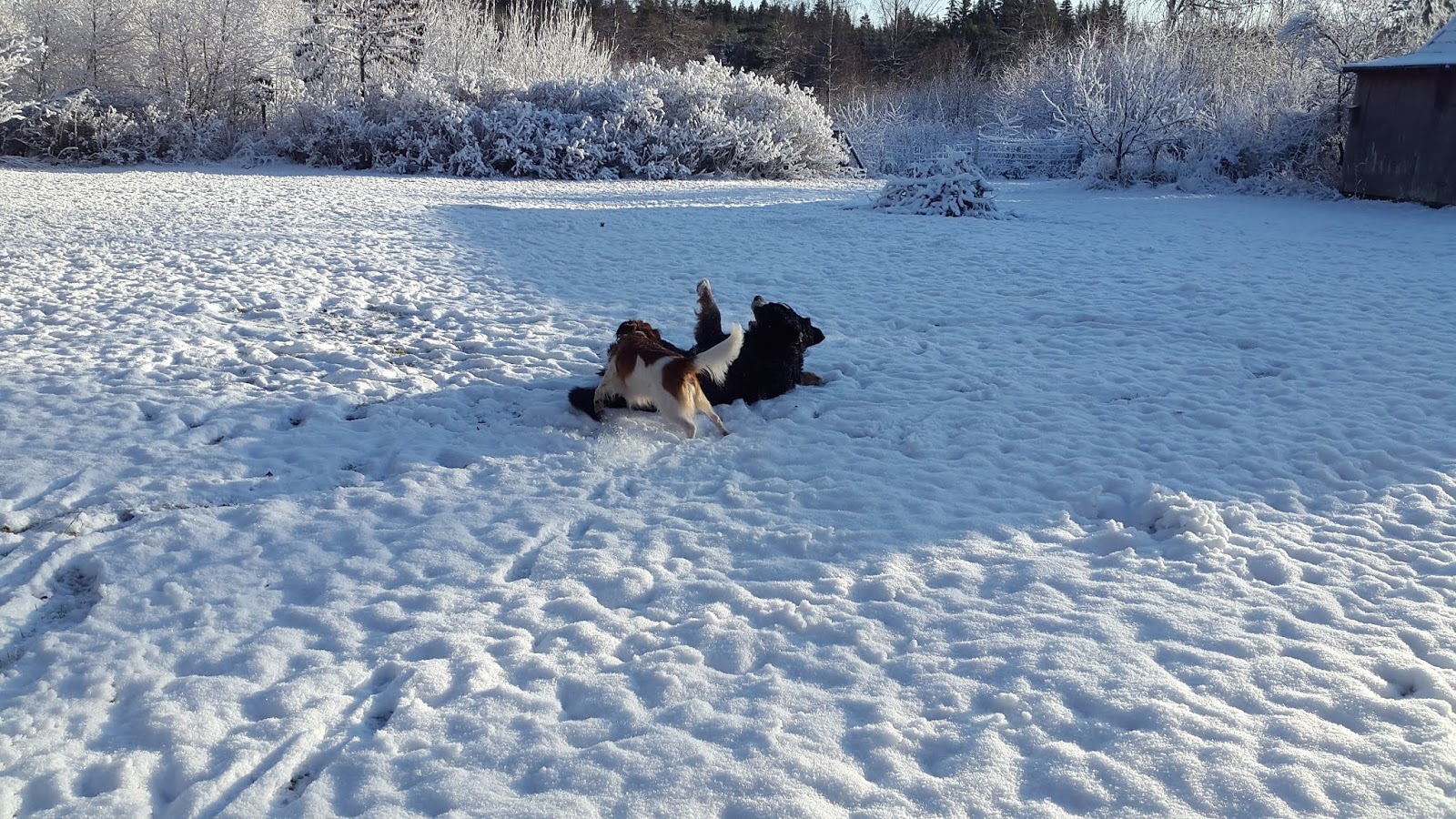 Ännu ligger snön kvar. I helgen var det -9 grader, idag är det -2. Vi får se hur länge snön ligger kvar. Hoppas det ligger fram till jul, för det är en fröjd att se hundarnas glädje. Jag blir alldeles varm i hjärtat.