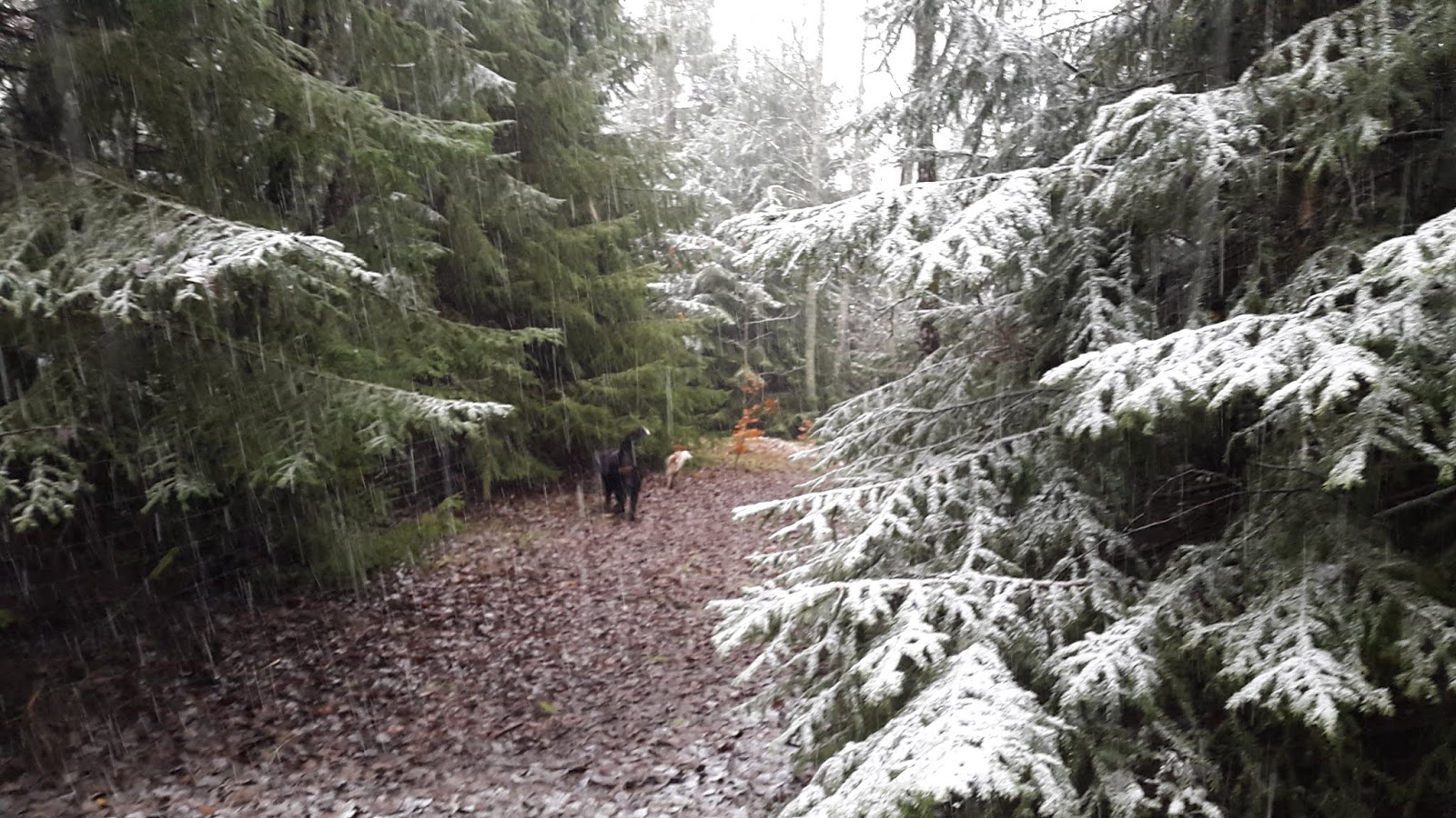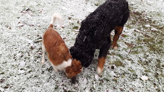 Då kom den äntligen, den första snön. Kotten och Kiara gör allt för att äta upp så mycket som möjligt av den.