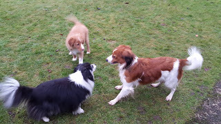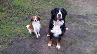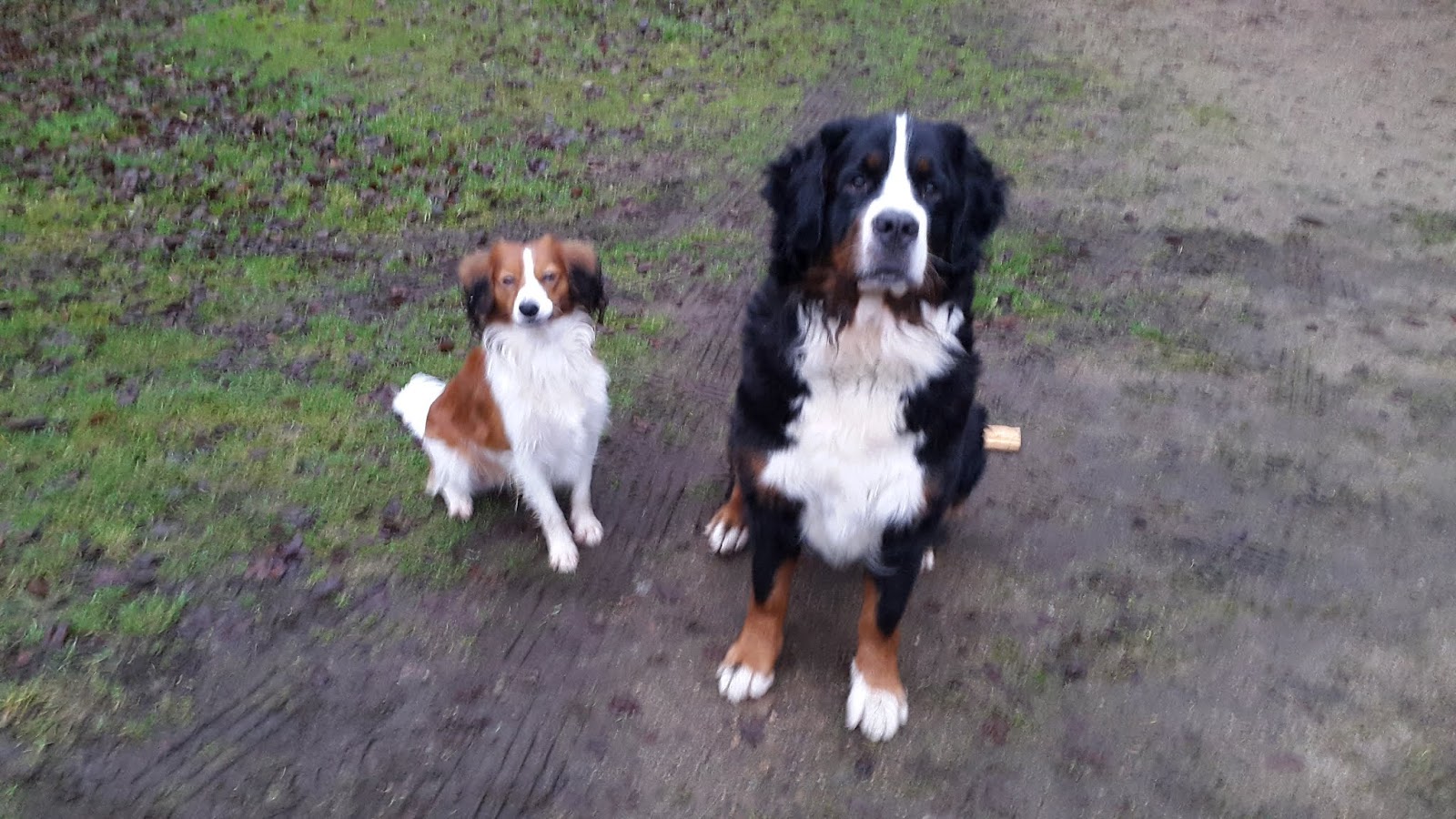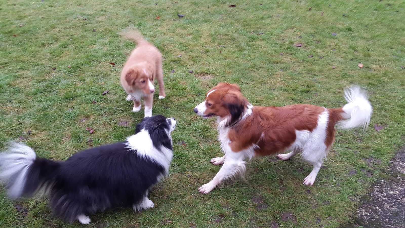 Kooikerhunden Kotten får besök av Berner Sennenvalparna M och M .
