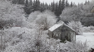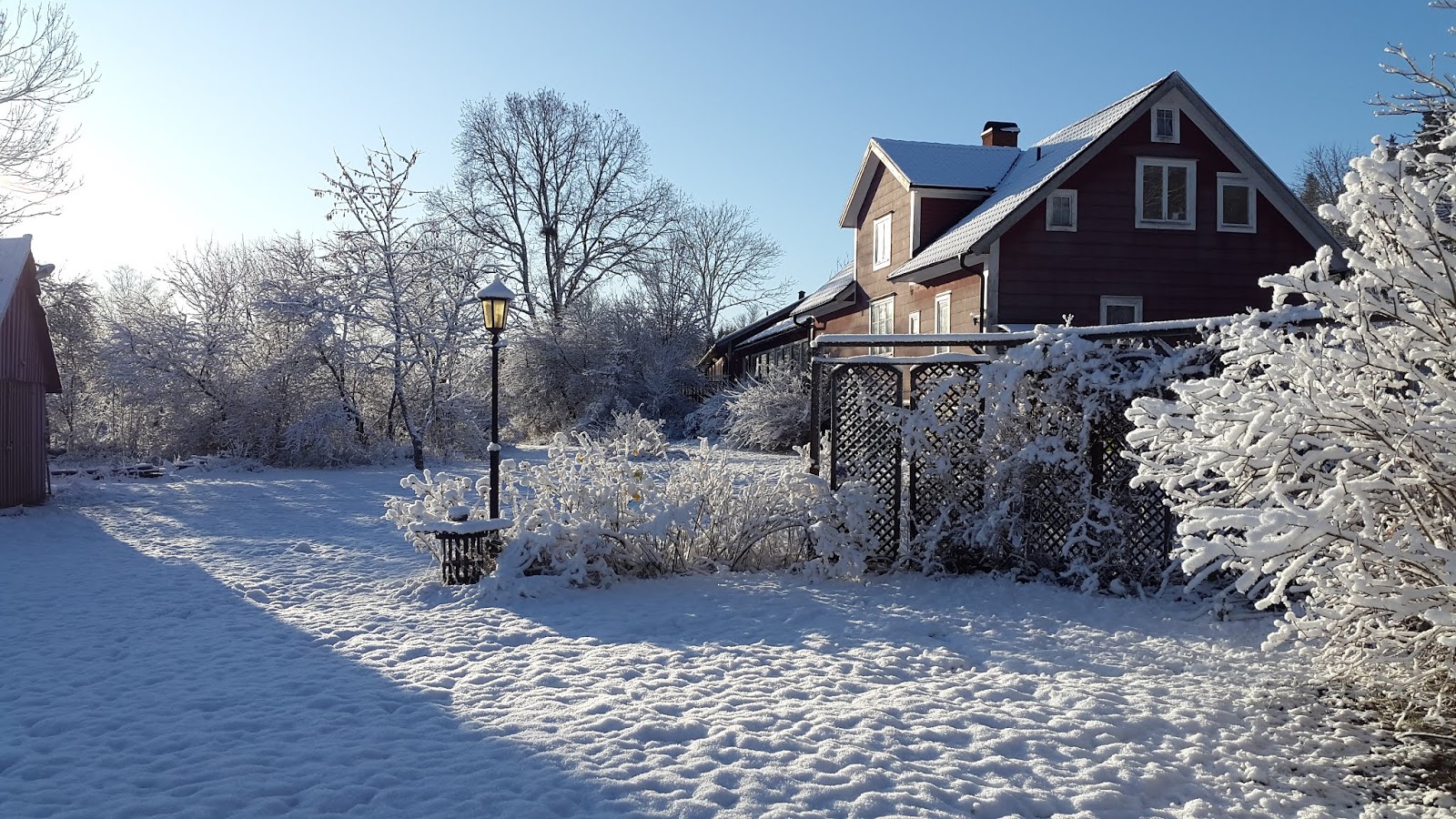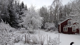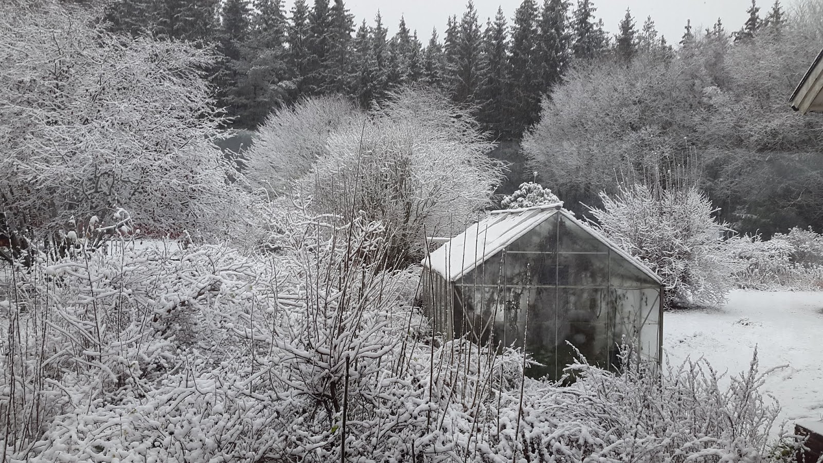 Visst är det vackert med snön. Nu gäller det att tänka på att ta bort snön från växthuset i vinter. Förra vintern spräcktes två glasrutor av tyngden.