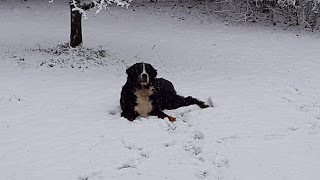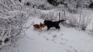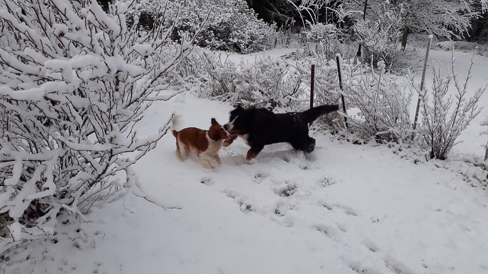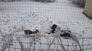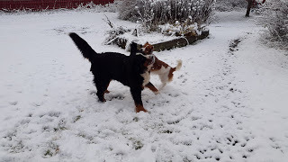 Då kom den, äntligen tycker hundarna. Visst är det fint, speciellt nu när snön ligger som ett täcke över allt, det inte är geggigt och smutsigt... Men det innebär halka och skrapa bilar. Än så länge har vi inte fått så mycket att vi har behövt skotta, bara sopa undan. Det är svårt att få Kotten och Kiara att komma in nu. De slår dövörat till och hör inget alls när de rusar runt och busar i snön, som blir allt plattare för varje dag efter att de har rullat runt i den.